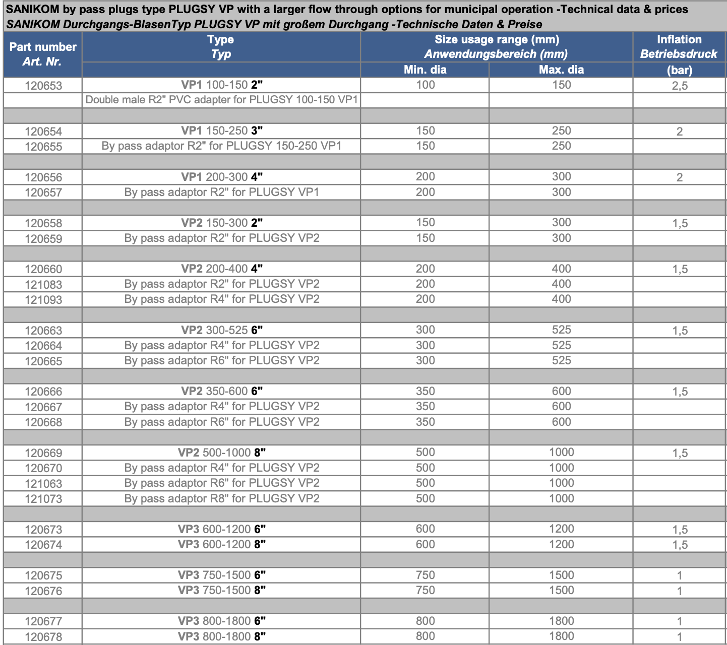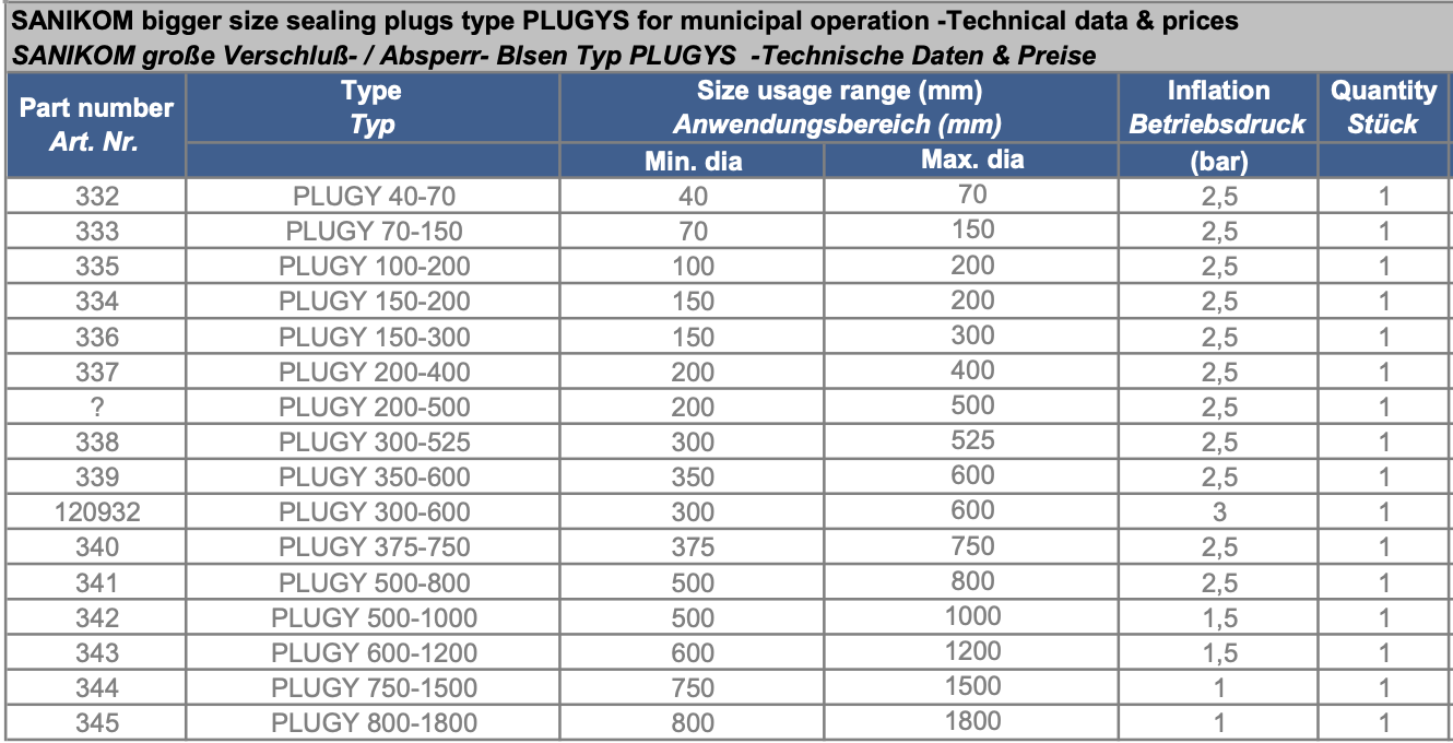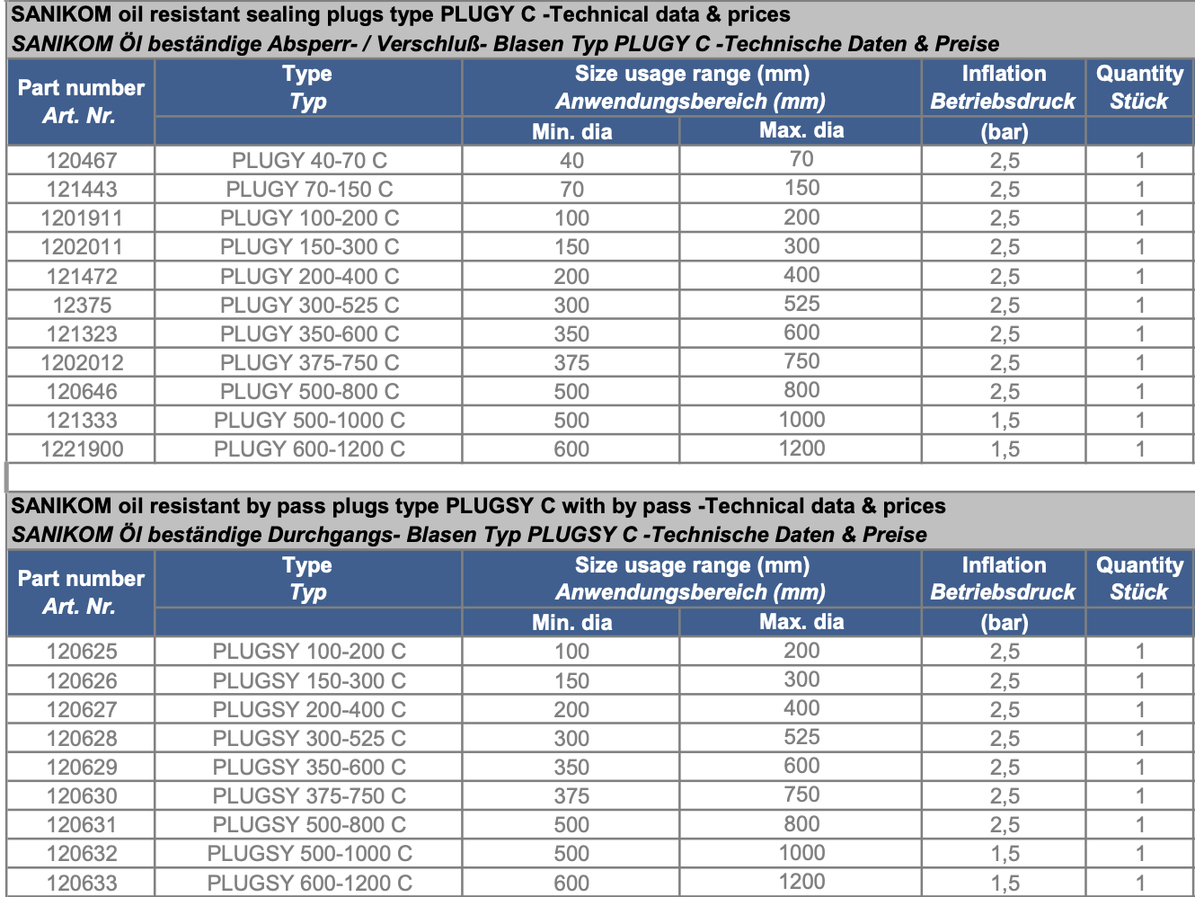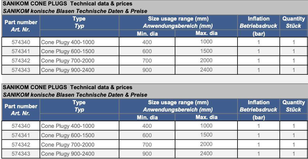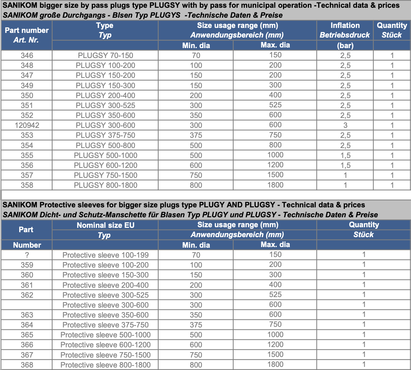 These plugs cover the range from 100 to 1800 mm. Replaceable rubber sleeve and installed mate- rial do not corrode. They are reinforced with Kevlar cord and assure safe and simple handling. |