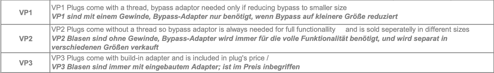| Name | Single and multi size plugs | Multi size plugs | House testing plugs | Larger flow plugs |