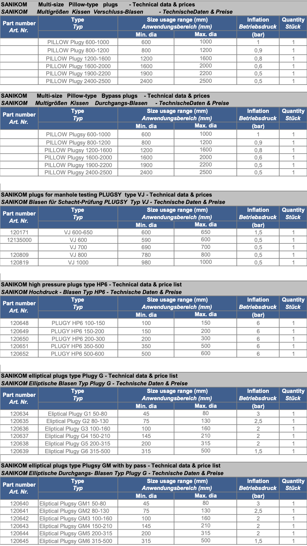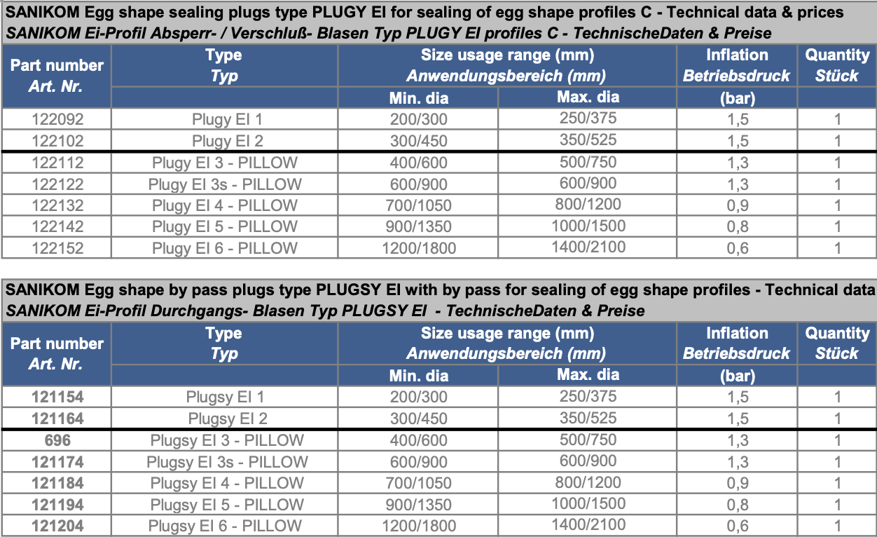 | Name | Egg shape plugs | Multi-size plugs G and GM | Pillow-type plugs | Manholes testing plugs |